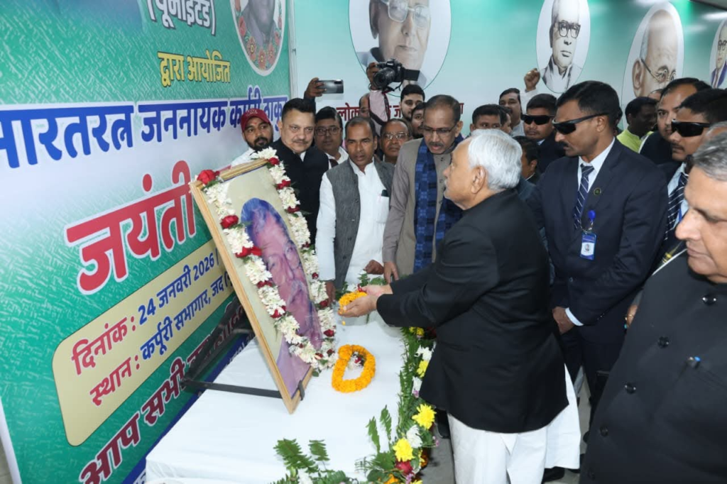 CM Nitish Kumar: शनिवार को जनता दल (यू0) प्रदेश कार्यालय, पटना में भारत रत्न जननायक कर्पूरी ठाकुर (Bharat Ratna Jan Nayak Karpoori Thakur) की 102वीं जयंती के अवसर पर भव्य समारोह का आयोजन किया गया। समारोह का शुभारंभ पार्टी के राष्ट्रीय अध्यक्ष सह माननीय मुख्यमंत्री श्री नीतीश कुमार ने दीप प्रज्वलित कर किया। इस अवसर पर उन्होंने जननायक कर्पूरी ठाकुर के तैलचित्र पर पुष्पांजलि अर्पित कर उन्हें श्रद्धापूर्वक नमन किया।
