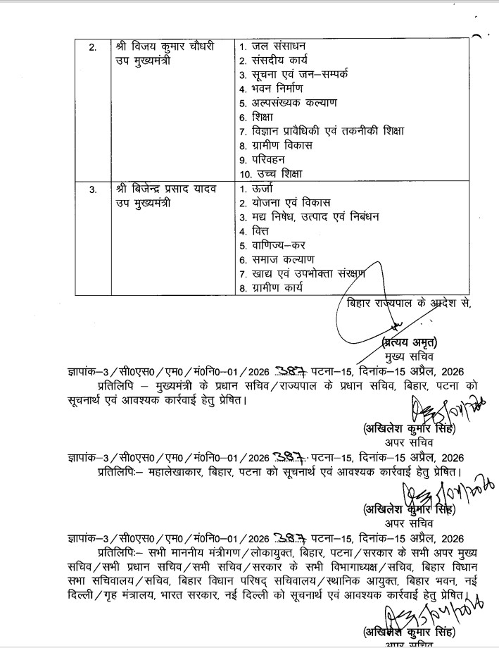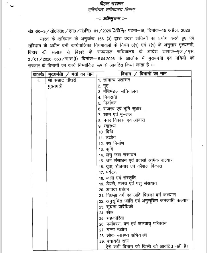 नीतीश के मंत्रालय सम्राट को सौंपे गए: मौजूदा नई सरकार के गठन में, मुख्यमंत्री सम्राट चौधरी के साथ केवल दो अन्य मंत्री हैं। इसलिए, मंत्रालयों का बंटवारा इन्हीं तीनों व्यक्तियों के बीच किया गया है। सम्राट चौधरी फिलहाल उन सभी विभागों की देखरेख करेंगे जो पहले BJP के पास थे। इसके अलावा, वे उन मंत्रालयों का भी प्रबंधन करेंगे जो HAM, राष्ट्रीय लोक मोर्चा और LJP (राम विलास) से संबंधित मंत्रियों को सौंपे गए थे।